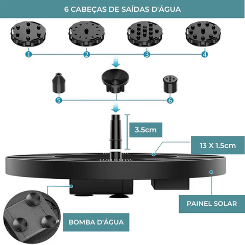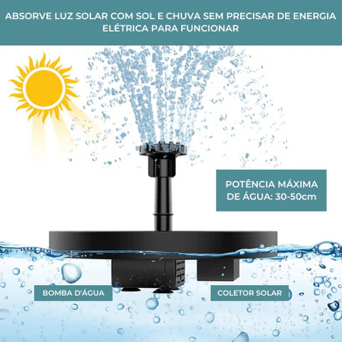 Funciona automaticamente quando a luz do sol atinge o painel solar. Altura máxima do chafariz: 30 a 55 cm